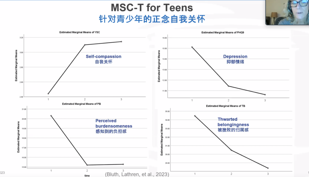 这项研究的结果非常鼓舞人心。从研究前到研究后,参加者自我关怀度不仅有了显著的提高,而且在随访中也保持了这种良好变化,他们还报告说,他们在抑郁、焦虑、复原力、对生活的满意度以及感知到的负担方面也有了显著的改善。三个月后,青少年在归属受挫方面也有明显下降(见图 1)。