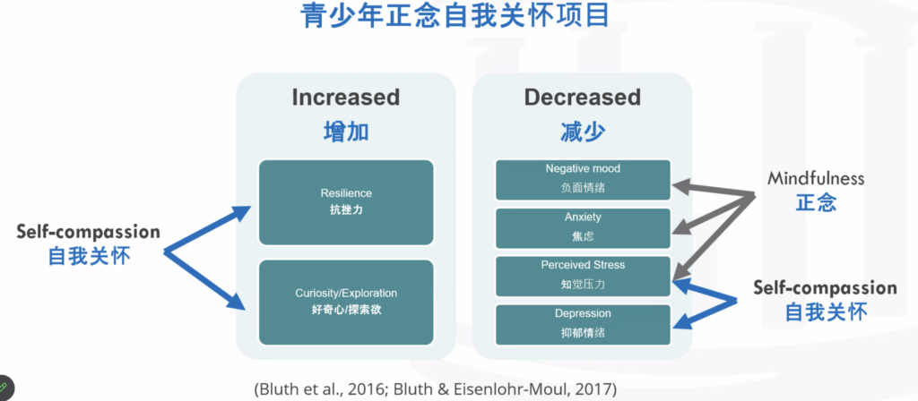 研究表明:参加正念自我关怀的青少年会增强韧性,抗挫力,保持更大的好奇心和探索欲;有效的减少负面情绪,压力,焦虑等。